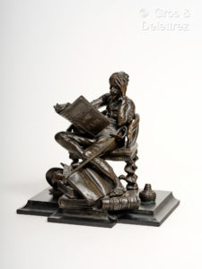 DON QUICHOTTE EN BRONZE BRONZE DU XIXème SIECLE. DON QUICHOTTE LISANT DES ROMANS DE CHEVALERIE d'après une gravure allemande du XIXème siècle. Espagne, Sans éditeur, [fin XIXème]. Sur socle en marbre noir, il mesure 23 cm x 15 cm x 23 cm de...