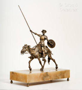 BRONZE DE DON QUICHOTTE A CHEVAL. Espagne, sans éditeur, [ca. 1900]. Beau travail en bronze doré de 30 cm x 30 cm plus la lance de 40 cm. Il est fixé sur un socle en onyx avec petits pieds en laiton. Les éperons et la laisse sont amovibles....