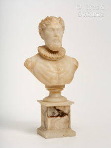 LE PLUS CELEBRE POETE PORTUGAIS CAMOENS. Buste de l'auteur des "Lusiades". France, Sans éditeur, [Milieu XIX ème]. Buste de Camoens, couronné de lauriers, sur piédouche carré (9 x 9 x 9 cm). La sculpture est en albâtre et mesure 25 x 16 cm;...