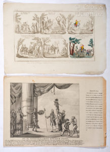 anglo-saxonne qui rassemble Don Quichotte et le Chevalier d'Eon. Texte anglais avec traduction juxtalinéaire : " Don Quichotte défie le futur époux de la princesse accouchée d'un gros garçon, et réclame ses droits sur la personne de la reine et maintenir sa virginité ; le bouillant Sancho étant en altercation avec le procureur et le marchand de vin et prétend malgré l'un et l'autre à l'honneur d'être le père nourricier du jeune Prince nouveau-né. " La référence à Don Quichotte traverse le temps (nous sommes au XVIII ème siècle), l'espace (ici l'Angleterrre) et les genres (la caricature et la parodie) ! Nous n'avons trouvé aucune trace de cette planche anglaise. (On joint): POUR LES ENFANTS D'AUTREFOIS [CERVANTES]. HISTOIRE DE DON QUICHOTTE. A Paris, Chez Basset, [c. 1810 ] Planche de 32 cm x 21 cm. Cette planche réunit six scènes du Quichotte. Visiblement à l'usage des enfants, elles sont partiellement coloriées. Nous n'avons trouvé aucune référence.
