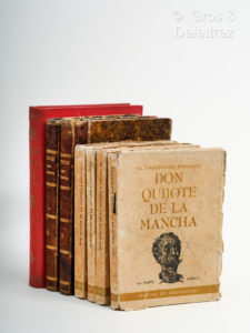 Quichotte, dos lisses décorés de fleurons dorés Non citée par Palau, ni par Henrich, cette édition semble être une reprise de celle qui parut chez L. Tasso en 1897. Avec des dessins de Gustave Doré (reproducciones foto-zincogràficas). Les couvertures sont des aquarelles en couleurs de S. Tusello d'après G. Doré. Cette parution en 1905 a pour but de célébrer le 400 ème anniversaire de la première publication du Quijote. UNE EDITION CUBAINE DU QUIJOTE ! (On joint). CERVANTES SAAVEDRA (Miguel de). EL INGENIOSO HIDALGO DON QUIJOTE DE LA MANCHA. Habana, Neptuno y Zulueta, 1905. Deux volumes in-8° (xvi-405 pp // vii-428 pp) demi-basane brune, dos lisses ornés de filets dorés. (Reliures du temps) reliures frottées ; mauvais papier. Rare et première édition cubaine publiée à l'occasion du 400 ème anniversaire de la publication de la première partie du "Quijote" en 1605. De nombreuses éditions ont été publiées de par le monde pour commémorer cet anniversaire. Elle sort de l’Imprenta y Estereotipia del " Diario de la Marina ". Palau ne cite pas cette édition, ni Henrich. [On joint] Miguel de Cervantes. El ingenioso Hidalgo Don Quijote de la Mancha. Edicion illustrada (dibujos de Doré et frontispice par Picasso) 4 tomes en 4 volumes brochés in 12 carré, couvertures salies. Pagination suivie de 1402 pp + tables. Gobierno Revolucionario. Imprenta Nacional. Cuba, 1960. Premiere œuvre imprimée par la "Revolucion". (On joint) CERVANTES SAAVEDRA (Miguel de). EL INGENIOSO HIDALGO DON QUIJOTE DE LA MANCHA. Madrid, Saturnino Calleja Fernandez, [1915] Un fort volume in-12, plein cartonnage gris illustré de l'éditeur. "Edicion popular" illustrada con grabados. Texte intégral. Palau, 52292 : édition illustrée par Manuel Angel, en 983 pp ; la nôtre comprend 916 pp plus le catalogue des publications. Varias réimpresiones. Ex-libris à la plume sur le titre : P. Valentin Mortiner Cogullada Zaragoza. De l'abbaye de Ligugé (la Vienne) où Renan fit une retraite.