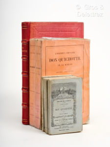 établie sur celle de Filleau de St Martin et de Viardot. Elle est illustrée d'un portrait et de huit planches de Vernet et Lamy. Palau, 52838. Henrich 357. Cet exemplaire nous a été offert par le professeur émérite de la Sorbonne Jean-Paul Duviols. (On joint) [CERVANTES]. DON QUICHOTTE DE LA JEUNESSE. Limoges, Martial Ardant frères1859. Un volume in-4°, demi-chagrin rouge, dos à nerfs orné de filets dorés, tr. dor. (Reliure de l'époque). Traduction abrégée de l'oeuvre de Cervantes par René d'Isle. Ouvrage illustré de quatre lithographies non signées en premier tirage. Rius, 575. Palau, 52843. (On joint). CERVANTES. DON QUICHOTTE. Paris, Aux bureaux de la publication, 1868. Quatre tomes en quatre volumes in-16, brochés, couvertures gris-bleu conservées. Petite édition publiée par la Bibliothèque nationale. La traduction est celle de Florian. Publication populaire destinée à vulgariser les grands textes classiques à petits prix. Non citée par Palau; Rius, 586.