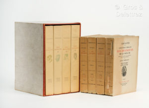 // 418 pp, 3 ff de table// 416 pp, 3ff de table // 415 pp, 3 ff de table. ) dos insolés, un dos fendillé sinon très bon exemplaire. Traduction nouvelle précédée d'une introduction par Jean Babelon. C'est une des traductions les plus correctes du vingtième siècle. Un des mille exemplaires numérotés sur vergé à la forme des papeterie d'Arches. Palau, 52991. (On joint). CERVANTES. L'INGENIEUX HIDALGO DE LA MANCHE Bruxelles Editions Terres Latines, [1947] Quatre tomes en quatre volumes in-4° (335 pp // 324 pp // 361 // 360 pp) brochés, couvertures cartonnées et illustrées. Bel exemplaire. Dernière édition française moderne citée par Palau (53027). Réalisée pour le quatre centième anniversaire de la naissance de Cervantes et imprimée par Firmin Desmet. Traduction de Louis Viardot et illustrations de René de Pauw (bois en couleur) 479/ 2000 tiré sur Alfa. DON QUICHOTTE ET LE VIN (On joint). [ALBUM NICOLAS / Cervantes]. SOUS LE SIGNE DE DON QUICHOTTE. Montrouge, Draeger frères. [1952] Album broché in-4°, dos à spirale, couvertures en couleurs. Liste des grands vins, 1953. Douze illustrations en couleurs de Léon Gischia. Ornements, typographie et mise page d'Alfred Latour. Catalogue annuel des grands crus millésimés en vente chez Nicolas.