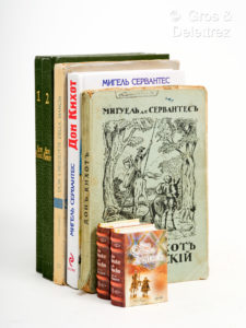 Illustrazioni e copertina di G. Bartolini Salimbeni. Settima edizione. Capolavori stranieri per la gioventù. EDITION RUSSE DE DON QUICHOTTE (On joint). MUZEIB de CEPBAHMEC CAABEGPA. XHTPOYMHBIN HAAABRO AOH KHXOT AAMAHYCKHH MHHCK, HAPOHHAR ACBETA, 1988. Deux volumes in-8° (400 pp / 432 pp) reliure en skivertex vert, titre en or (Reliure de l’éditeur) Traduction russe de Don Quichotte parue à la fin du XX ème siècle. Nous constatons, une fois de plus, le rayonnement mondial de ce chef d'œuvre de la littérature espagnole. Rappelons que Dostoiewsky, dans le " Journal d'un Ecrivain " a déclaré que Don Quichotte était : " l'un des livres les plus géniaux et les plus tristes qu'ait produits le génie humain. " La première édition en russe paraît à Saint Petersburg en 1769 ; elle ne comprend que les 27 premiers chapitres. La première édition complète est de Schukovxkiy d'après Florian, elle parait à Moscou en 1804. UN MINUSCULE PERUVIEN EN PORTUGAIS (On joint). CERVANTES SAAVEDRA (Miguel de). DOM QUIXOTE DE LA MANCHA. Lima (Peru), Los libros mas pequeños del Mundo, 2007. Deux tomes en deux volumes in-128 (6, 5 cm) de 474 pp, 3 ff et 474 pp, 3 ff. Plein cartonnage illustré en couleurs de l'éditeur. Etat neuf. Minuscule péruvien tiré à 10000 exemplaires. Autor da Seleçao e adaptaçào Pedro Briceño Polo ; desenho e diamagracion Martin Salas, Edhino Ceopa. Les illustrations sont inspirées, entre autres, de Gustave Doré. Le texte est adapté en portugais.