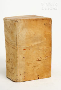 l'accompagnent. Lyon, Simon Rigaud, 1634. Un fort volume in-8° (6 ff, 1157 pp, 14 ff) plein velin rigide de l'époque, accroc sur un mors, ouvrage un peu dérelié. Traduction française de René Gaultier, Angevin (la première traduction de François de Rosset date de 1612 ; rappelons qu'il fut le premier traducteur de D. Quichotte). Cette seconde édition lyonnaise chez Simon Rigaud n'est pas signalée par Palau. Luis de la Puente (1554-1624) religieux de la Compagnie de Jésus fut le directeur spirituel de Thérèse d'Avila. Cervantes l'a-t-il lu, notamment quand il entre au couvent des Trinitaires Déchaussés ? Sur la page titre, deux médaillons gravés représentant I. de Loyola et St Fr. Xavier.