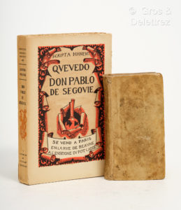 paru d'abord à Barcelone en 1627. Cette édition a été traduite de l'espagnol par M. de La Geneste. Influencé par "Lazarillo de Tormes", par le schéma général (très alambiqué) et par la simplification des épisodes, le "Buscon" laisse le récit en suspens et promet une seconde partie qui ne fut jamais écrite. La technique romanesque en est très primitive sans digressions morales. La satire dénonce une société qui a atteint les points extrêmes d'une décadence morale. Palau, 243952. [On joint] Don Pablo de Ségovie, broché in-12 parue à " l'enseigne du Pot cassé " en 1929 dans la collection Scripta Manent.. Traduction de Rétif de la Bretonne, illustrée par Henry Chapront.