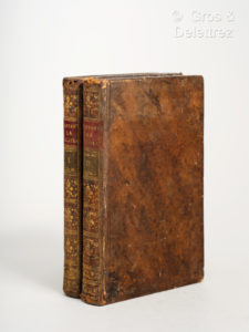 plein veau brun, dos lisses ornés, tranches rouges (Reliures du XVIII ème siècle) coiffes usées et quelques épidermures sur les plats. Mais le corps du volume est très frais. Belle édition très soignée publiée par Sancha et illustrée de douze gravures sur cuivre de Josef Ximeno en premier tirage. Salva, 1742 : la presente edicion es muy belle, y esta probablement copiada de la de Barcelona aunque no lo dice. Curieusement cet ouvrage fait partie de la bibliothèque de Don Quichotte. Dans le chapitre VI, Cervantes nous dit par la bouche du barbier : Il y a bien des années que ce Cervantes est de mes bons amis et, je sais qu'il est plus versé en infortunes qu'en vers. Son livre ne manque pas d'une heureuse invention, il propose mais ne conclut pas : il faut attendre la seconde partie qu'il promet." Cette autocritique est amusante et souligne que Don Quichotte lisait aussi les ouvrages récemment parus. "L'ouvrage est en prose et en vers suivant le modèle de l'Arcadie de Sannazar que Cervantes imite non seulement dans les lieux et l'action mais encore dans le déroulement du récit formé d'épisode juxtaposés sans aucun lien entre eux sinon l'identité des personnages. L’imagination de Cervantes nous offre un monde de beauté idéale qui prend le nom et le visage de Galatée. Platonisme emprunté à Léon Hébreu, élégance à la Bembo et à la Castiglione, prédilection pour la préciosité. »(Laffon-Bompiani II, p. 420). Palau, 51937 : les planches dessinées par J. Ximeno, sont gravées par J. Pro, Moreno Tejada, S. Brieva, B. Vasquez et J. Fabregat.
