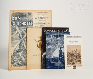 illustrée d'une grande lithographie représentant un moulin. [Nous joignons] Un programme cartonné in-8° du Théatre Lyrique municipal de la Gaité de décembre 1910. Il s'agit de Don Quichotte, comédie en cinq actes, poème de M. Henri Cain (d'après Le Lorrain) Musique de M. Massenet. La distribution était la suivante : La belle Dulcinée, Mlle Lucy Arbell ; D. Quichotte, M. Marcoux et Sancho, M. Lucien Fugère. Illustré de trois illustrations d'après Coypel, Doré. [Nous joignons aussi] Le numéro de l'Avant Scène (n°93) de décembre 1986. Remarquable étude sur Cervantes, l'Opéra de Massenet et le film de Pabst (1932). [Nous joignons enfin] Deux programmes, l'un autrichien (Vienne 1988) et l'autre hollandais (1980-1981).