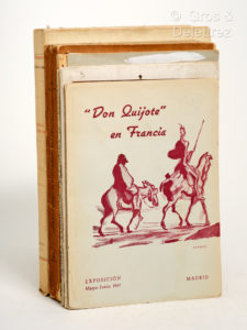 pobreza de Cervantes, la Tia Fingida, retendidas imitaciones etc... (On joint). AMERICO CASTRO. EL PENSAMIENTO DE CERVANTES. Madrid, Hernando, 1925. Grand volume broché in-8° (408 pp). On y trouve : Analysis del sujeto, la naturaleza, ideas religiosas, la moral etc... Ouvrage très savant. (On Joint). TROIS CATALOGUES D'EXPOSITIONS CERVANTINES EN 1947. CERVANTES / DON QUIJOTE EN FRANCIA / PRIMERA EXPOSITION EN URUGUAY. Paris, Madrid, Montevideo, B. n. f, Instituto frances, Artes graficas Covadonga, 1947 / 1962. Trois plaquettes in-8° brochées de 33 à 104 pp. Trois expositions organisées en France, en Espagne pour la commémoration du 400 ème anniversaire de la naissance de Cervantes. Très bonnes documentations. La publication urugayenne est une ré-édition de 1962 concernant la collection d'Arturo E. Xalambri. (On joint). DON FRANCISCO RODRIGUEZ MARIN. ESTUDIOS CERVANTINOS. Madrid, Ediciones Atlas, 1947. Fort volume petit in-4°, broché (656 pp). Ces miscellanées publiées à l'occasion du 400 ème anniversaire de la naissance de Cervantes rassemblent de nombreux articles : la prison où écrivit l'auteur, les modèles vivants du Quijote, le portrait de Miguel de Cervantes, Don Quichotte en Amérique en 1607 etc... [Nous joignons] Estudios Cervantinos de M. Menendez y Pelayo parus à Buenos Aires en 1947 : interpretationes del Quijote, el Quijote de Avellaneda. .
