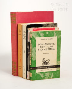 MAEZTU (Ramiro). DON QUIJOTE, DON JUAN, Y LA CELESTINA. Madrid, Espasa-Calpe, [1963] Petit volume in-12, broché (160 pp + cat. de la colec. Austral). Réunion d'articles de Maeztu " el periodista con ideas ". (On joint). MIGUEL DE UNAMUNO. VIDA DE DON QUIJOTE Y SANCHO. Montevideo, Ministerio de intruccion publica, 1964. Un volume in-8°, broché (336 pp + indice). Célèbre ouvrage dans lequel, Miguel de Unamuno, résume et analyse chaque chapitre du roman en réglant ses comptes avec Cervantes tout en défendant Don Quichotte. [Nous joignons] Unamuno, La vie de D. Q. et de Sancho Pança. Paris, Albin Michel, 1959, in-12 br. Traduction et avant-propos de Jean Babelon. (On joint). JUAN ANTONIO CABEZAS. CERVANTES DEL MITO AL HOMBRE. Madrid, Biblioteca Nueva, 1967. Un fort volume in-4° (457 pp + Indice) pleine percaline brique d'éditeur. Très bonne étude biographique de Cervantes qui va de son enfance à sa vieillesse. Elle est très circonstanciée et suivie d'une "Seleccion de bibliografia en castellano ". [Nous joignons] Donald P. McCRORY : No ordinary Man, The Life and Times of Miguel de Cervantes. NY, 2005. This bibliography is based on new original research, and incorporates previously unpublished material on Cervantes' long period of captivity in Algiers.