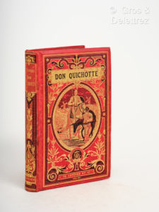 plaque dorée du Lycée impérial de Rouen sur les deux premiers plats. (Reliures du temps) Bon exemplaire. Edition revue et corrigée par M. l'abbé Lejeune, chanoine, Professeur à la faculté de théologie de Rouen. Nouvelle édition, nouvelle traduction illustrée par Célestin Nanteuil. Les deux frontispices sont de Budzilowicz. Palau, 52850 signale la même édition in-4° et non in-12 avec six planches. (C'est probablement une erreur. ) LA BIBLIOTHEQUE ROSE. (On joint). CERVANTES SAAVEDRA. HISTOIRE DE L'ADMIRABLE DON QUICHOTTE DE LA MANCHE. Paris, Hachette, Cette édition (et les suivantes) est illustrée de 64 vignettes par Bertall et Forest. Palau, 52864. [On Joint quatre autres éditions] La seconde de 1868 en demi-reliure (Henrich, 368). Deux éditions en plein cartonnage rouge d'éditeur datées de 1888 et de 1899 (Fer du Lycée Racine sur le second plat). Cette multiplicité d'éditions souligne le vif succès de ce chef d’œuvre dans les établissements scolaires au cours de la seconde partie du XIX ème siècle. (On joint). CERVANTES (Michel). DON QUICHOTTE DE LA MANCHE. Paris, Théodore Lefèvre et Emile Guérin, [1887 ?] Un volume in-8°, pleine percaline rouge décorée d'une grande plaque dorée représentant nos deux héros. (Reliure signée Engel) Bel exemplaire. Belle édition abrégée à l'usage de la Jeunesse, d'après la traduction de Florian. Elle est illustrée d'un portrait et de vingt planches tirées d'une suite du XVIII ème siècle. Elle n'est pas citée par Henrich. Palau, 52906.