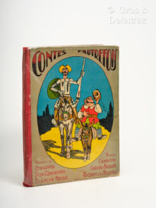 normande dont le texte est mis à la portée de la jeunesse par Th. Lemoine de Estevanez. Elle est illustrée de dix planches en noir non signées mais réalisées par un modeste suiveur de Gustave Doré. (On joint). CERVANTES (Michel). DON QUICHOTTE DE LA MANCHE. Nouvelle édition. Paris, Albin Michel, [1910 ?] Un volume grand in-4° de 319 pages, cartonnage rouge d'éditeur décoré de fers animaliers au palladium. Bon exemplaire. Edition non signalée (?) par Palau, mise à la portée de la jeunesse par Maurice Dreyfous. Elle est illustrée de très nombreuses gravures en noir et blanc hors-texte et in-texte signées G. Niezab. (On joint). [ALBUM DE TEXTES POUR ENFANTS]. RECUEIL DE CONTES D'AUTREFOIS. Liège, Imprimerie Gordinne, [1920 ?] Un grand volume in-4°, plein cartonnage décoré de l'éditeur. Histoires et Chansons contenues dans cet Album : -Voyage de Gulliver à Lilliput. -Voyage de Gulliver à Brobdingnag. -DON QUICHOTTE DE LA MANCHE. -Blanche Neige. -Le loup, la chèvre et les sept Biquets. -Riquet à la Houppe. -Chansons Enfantines. Récits très abrégés des "Classiques" de la littérature enfantine. Illustrations en couleurs de J. Zonchu et le Tallic.