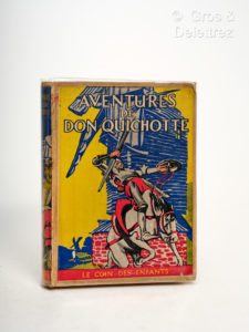 illustrations d'après les dessins de G. Staal sont gravées par Pannemacker, Mouard, Midderich... Jolie petite édition des années vingt à l'usage de la jeunesse. (ON JOINT). CERVANTES (Michel de). DON QUICHOTTE DE LA MANCHE. Tours, Maison Alfred Mame et Fils, [1927 ?] Un volume in-4°, plein cartonnage illustré de l'éditeur. Une des publications enfantines dont l'éditeur Mame à Tours s'était fait la spécialité depuis le XIX ème siècle. L'adaptation est de Joseph Groussin, imagée en noir et en couleurs par Albert Uriet. Palau, 52988 : hacia 1927, grabados y 16 laminas en colores. Extracto de los principales episodios. Entre les deux guerres Don Quichotte meurt à la fin de ses aventures comme dans le roman ; ce qui ne sera pas le cas par la suite. (On joint). CERVANTES. DON QUICHOTTE. Paris, Hachette, [1933] Un volume in-12, plein cartonnage rouge décoré de losanges dorés. (Reliure d'éditeur) De la collection des grands romanciers. Illustrations en noir et blanc de Félix Lorioux. Edition très modeste sur mauvais papier probablement à l'usage des établissements scolaires. Palau ne la signale pas en revanche il décrit une édition également illustrée par Lorioux publiée en 1934 chez Flammarion. PETITE EDITION NELSON. (On joint). [CERVANTES (Michel de)]. AVENTURES DE DON QUICHOTTE. Paris, Londres, Edimbourg et Toronto, Nelson, 1937. Un volume petit in-8° plein cartonnage d'éditeur, dos et plat illustrés de Don Quichotte "empêtré" dans un moulin. Petite édition Nelson de la collection "Le coin des enfants" illustrée de nombreuses gravures en noir et blanc ; le frontispice en couleurs est signé C. K. Howe et représente la barque enchantée. Adaptation du texte de Cervantes à l'usage des enfants. Cette édition a échappé à Palau.