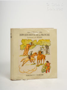 illustrée de huit planches en couleurs de J. J. Mennet. Palau ne la signale pas. (On joint). [CERVANTES]. DON QUICHOTTE. Paris, Librairies-imprimeries réunies. L. Martinet, [1948 ?] Album in-4°, plein cartonnage illustré de l'éditeur. Publiées dans la collection "Bibliothèque de la Jeunesse et de l'Enfance" les aventures de Don Quichotte sont suivies d'Ali-Baba, de Gargantua, du baron de Krack, de l'oiseau bleu et de Riquet à la Houpe. Les illustrations en couleurs sont signées Myrbach. (On joint). CERVANTES SAAVEDRA (Miguel). LA MERVEILLEUSE HISTOIRE DE DON QUICHOTTE DE LA MANCHE. Liège et Paris, Chagor, [1950 ?] Un volume in-4° (253 pp, 1 ff de table) cartonnage illustré en couleurs de l'éditeur. Belle publication enfantine dont le texte est adapté par Tom Louis. Les illustrations dont sept in-texte en couleurs sont d'Alexis Peclers. RETIRAGE DES ILLUSTRATIONS DE LORIOUX. (On joint). CERVANTES. DON QUICHOTTE Paris, Librairie Hachette, [1951]] Plaquette in-8° (60 pp, 1 ff) plein cartonnage rouge illustré d'une planche en couleurs de F. Lorioux. Retirage de l'édition de 1933. De la collection des grands romanciers. Illustrations en blanc et noir de Félix Lorioux. Imprimé chez Brodard et Taupin. PETIT MANUEL SCOLAIRE. (On joint). CERVANTES. DON QUIJOTE DE LA MANCHA. NOVELAS EJEMPLARES. Toulouse / Paris, Privat/ Didier, [1951]] Petit volume in-12, cartonnage beige illustré (Reliure de l'éditeur) Collection Privat des classiques espagnols. Textes annotés par Th. Alaux et L. Sagardoy. Petit manuel scolaire avec des extraits commentés du Quichotte et des Nouvelles exemplaires. Il est assorti de notes de vocabulaire et de questions assez pertinentes.