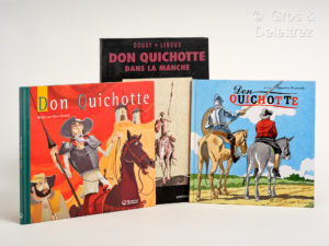 maniés dont les dos sont brunis, avec quelques accidents aux coiffes et aux plats. Les couvertures vertes sont datées de 1827. Palau, 52783. 2)- HISTOIRE DE DON QUICHOTTE. Traduite sur le texte original par F. de Brotone. D'après les traductions comparées de Oudin et Rosset, Filleau de Saint-Martin, Florian, Bouchon-Dubournial et Delaunay. Paris, Lefèvre et Desrez, 1837. 2 vol in-8° demi veau brun époq. Dos à la rocaille, rel. Frot. Un mors fendu, coins émoussés. Palau, 52800 : un buen trabajo con el texto integral y cuidado. 3)-L'ADMIRABLE DON QUICHOTTE. Traduction nouvelle par M. Damas Hinard. Paris, Charpentier, 1847. 2 vol. in-12, non rognés, pleine percaline noire d'époque. Mors, coiffes et coins accidentés. Première édition de cette traduction qui s'inspire de celle de Viardot légèrement modifiée. Rius, 556 ; Palau, 52815 : La vida de Cervantes esta inspirada en la de Navarrete. 4)- DON QUICHOTTE. Nouvelle édition mise à la portée de la jeunesse par Mallat de Bassilan. Illustré de nombreuses gravures par Poirson, Guillaume, Pelcoq. Gravures sur bois de Jouenne. Paris, Dreyfous & Dalsace (c. 1893) vol. in-8° pleine percaline noire époq. Mors fendus. Palau, 52916 : es un compendio agradable y conserva todo el relieve del texto de Cervantes.