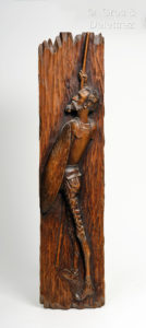 ocres. Il est fermé par deux gros fermoirs. Le dos porte le titre du roman et le nom de son auteur. Les plats suggèrent Don Quichotte et Sancho Pança dans un paysage apocalyptique. Véritable vision irréelle, quasi aquatique ! Nous sommes dans un autre monde. Cette céramique contemporaine est signée CV (Claire Vincent).