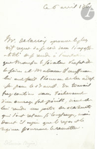 Eugène DELACROIX (1798-1863). L.A.S. (signée en-tête, à la 3e personne), 6 avril 1861, au Baron Haussmann ; 1 page in-8.{CR}« Mr. Delacroix » ne peut se rendre à l’invitation du Préfet et de Madame Haussmann. « Un travail trop continu...
