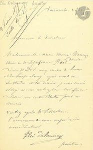 Jules-Élie DELAUNAY (1828-1891). L.A.S., 2 février 1879, à un directeur ; 1 page in-8.{CR}Recommandation d’une peintre danoise Mlle Anne-Marie Brunyr, élève du professeur Roed, qui désire « étudier aux musées du Louvre et du...