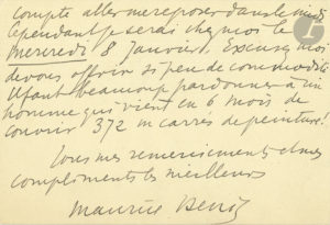 Maurice DENIS (1870-1943). L.A.S., [1912] ; 2 pages oblong in-12.{CR}Au sujet de sa décoration du Théâtre des Champs-Élysées. Il demande à son correspondant « de venir voir ma coupole que je montre Dimanche prochain 11 heures (Théâtre...