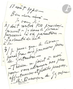 volume doit sortir très prochainement », qu’il lui fera parvenir. Il est enchanté de sa visite à Louveciennes et « de votre sympathie à mon livre de Dessins – Votre jugement très indépendant et éclairé compte beaucoup pour moi »…