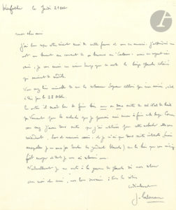 Jean-Émile LABOUREUR (1877-1943). L.A.S., Kerfalher jeudi 21 octobre [1926, à Camille Bloch] ; 1 page petit in-4.{CR}Il remercie son ami pour l’envoi des 1000 francs, et s’inquiète de l’avancement de Couleurs [Remy de Gourmont, Couleurs,...