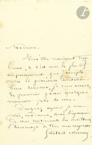 Gustave MOREAU (1826-1898). 3 L.A.S. à Mme Hortense Howland ; 2 pages et demie (deuil), 1 et 1 pages in-8, enveloppes.{CR}Absent de Paris, Moreau prie sa voisine de la rue de La Rochefoucauld de l’excuser pour « les ennuis de cet odieux...