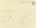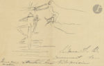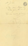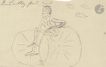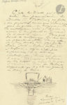 lui prêter 600 francs : « au début d’avril j’ai de sérieuses rentrées, & je te rendrai le capital, & les intérêts en épreuves inédites ! » Il signe « Fély », et dessine, sur la double page intérieure, une « chandelle brûlant par les deux bouts avec la devise Vita per ignem ! », et une deuxième d’une « forme plus héraldique & chaudepissarde ! »{CR}Mardi. Il est en retard : « J’attendais des fonds, “des pépettes” comme nous disions, nous gens de guerre, – en Belgique. Et maintenant, voilà qu’il arrive un accroc à la planche de Guiches ! [pour La pudeur de Sodome 1888 ?] Et il faut la réparer ! Peux pas laisser ce malheureux Guiches avec sa planche inutile ! Mais cela sera fini demain soir, sans faute !  Donc Jeudi – Enfin ! Enfin ! ! ! ! ! » Il pourra le rejoindre à Contrexéville. Il se dessine assis à sa table de travail, vu de dos, avec la légende :« Rops réparant la planche de Guiches » et termine ainsi sa lettre : « Con de Rex de Ville que tu es ! ! ! Tu me rends gâteux ! ! »{CR}On joint 2 dessins à la plume (1 page oblong in-8 chaque, fentes au pli) : un cycliste sur un vélocipède à grandes roues, légendé : « Ne l’oubliez pas » ; et « La Muse S.B.[Sarah Bernhardt] couronnant la Vélopoésie. Nous vous attendons samedi matin ».