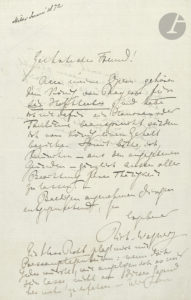 Richard WAGNER (1813-1883). L.A.S., [mi-juin 1872, à un de ses agents et impresarios, Carl Voltz ou Carl Batz] ; 1 page et demie in-8 ; en allemand.{CR}Sur ses opéras et Louis II de Bavière.{CR}« Alle meine Opern gehören dem König von...
