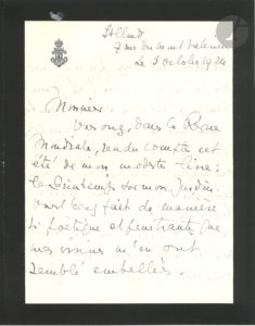 article dans la Revue Mondiale sur « mon modeste livre Le Printemps sur mon jardin » dont il a parlé « de manière si poétique et pénétrante que mes visions m’en ont semblé embellies. Ne viendrez-vous pas un jour jusqu’à ce jardin ? Le printemps n’est plus, mais l’automne commence à dorer les feuilles, et j’aimerais, sous ces doux ombrages, causer avec vous »… – 18 octobre. Sur les livres de Ségur, louant « les pages fortes et subtiles où vous dissertez de l’amour, ce levier de toutes les forces ! » Elle a aimé ses trois romans, a été ravie par la justesse de sa peinture de la femme, et par le charme mélancolique de Mr Renan, mais a une préférence pour Une île d’amour « avec sa fantaisie légère et écumeuse recouvrant de philosophiques paradoxes et d’éternelles vérités »… Son ami le Dr Laforgue, « qui se rattache à l’école de Freud », a été enthousiasmé par une citation de Renan ; il prépare un ouvrage « qui a trait aux névroses et à la psychanalyse » …{CR}1925. 3 mars. Elle a lu ses Conservations avec Anatole France, ou les Mélancolies de l’intelligence, et souhaiterait en causer avec lui : « Nous reparlerons de ces mélancolies que vous savez si bien évoquer, et qui s’élevant à des régions toujours plus hautes, font de votre dernier livre comme la montée d’une cime enneigée »… – 12 mars. Elle s’attriste de son brusque départ qui interrompt leurs causeries… – 25 mai. Invitation à déjeuner à Saint-Cloud avec des amis proches. – 15 juin. Elle lui renvoie « le charmant conte que vous m’avez prêté et qui m’a fort plu ! » Elle espère bientôt lire d’autres œuvres… – 8 octobre. Elle l’invite à déjeuner, bien que la brume « enveloppe les feuillages, et une grande fatigue, après mes chagrins de cette année, me retient à la maison. Mais si vous ne craignez pas de ne voir les arbres qu’à travers la vitre, et leur amie qu’étendue sur un divan, je serai heureuse de vous accueillir »… Etc.