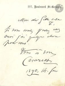 Jean-Martin CHARCOT (1825-1893). L.A.S., 14 février 1890, à Gilles de la Tourette ; 1 page in-12 à son adresse 217 Boulevard Saint-Germain.{CR}« Si vous passez chez moi j’ai quelque chose pour vous ».{CR}On joint une ordonnance autographe...