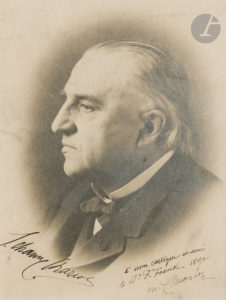 Jean-Martin CHARCOT (1825-1893). Photographie avec dédicace autographe signée ; encadrée, à vue 25 x 19 cm.{CR}Beau portrait de profil, dédicacé dans le bas : « à mon collègue et ami le Dr. F. Franck, 1890. M. Charcot ».{CR}Sur le...