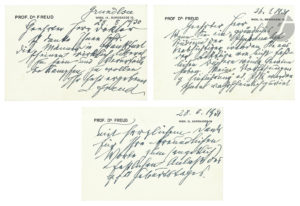 Sigmund FREUD (1856-1939). 2 L.A.S. et 1 L.A., 1930-1936, au Dr Karl Frankenstein ; 4 pages oblong in-12 sur cartes à son en-tête et adresse Prof. Dr. Freud Wien IX, Berggasse 19 ; en allemand.{CR}[Karl Frankenstein (1905-1990), psychologue...