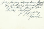 berlinois, dirigeait le fonds d’aide aux artistes et intellectuels juifs : Hilfswerk für Jüdische Künstler und Feistarbeiter.]{CR}Grundlsee 28 août 1930. Il le remercie et fait l’éloge des hommes libéraux de Francfort qui veulent combattre les préjugés : « Die Männer in Frankfurt scheinen wirklich liberal zu sein und Vorurteile bekämpfen zu wollen ».{CR}Wien 28 mai 1931. Il le remercie de ses aimables paroles à l’occasion de son 75e anniversaire : « mit herzlichem Dank für ihre freundlichen Worte zum (angeblich) Anlaß des 75ten Geburstages ».{CR}Wien 26 janvier 1936. S’il a l’intention d’entreprendre une étude approfondie de la psychanalyse, il ne gagnera pas grand-chose à lire des livres faciles à comprendre. Et les cours de Freud d’Introduction à la Psychanalyse seront probablement trop pour lui. Il conseille l’œuvre élémentaire de Hans Zulliger sur la vie inconsciente de l’âme…{CR}« Wenn Sie ein “gründliches” Studium der Psychoanalyse beabsichtigen, werden Sie aus der Lektüre von leicht faßlichen Büchern wenig Gewinn haben Meine Vorlesungen z[ur] Einführung i[n] d[ie] Ps[ycho]A[nalyse] werden Ihnen wahrscheinlich zuviel sein Ein ganz elementares Werk ist Zulliger’s Unbewußtes Seelenleben »… [Hans Zulliger (1893-1965) : Unbewußtes Seelenleben. Die Psychoanalyse Freuds in ihren Hauptzügen (Stuttgart, Franck, 1924)].