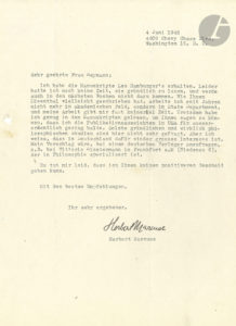 Herbert MARCUSE (1898-1979) sociologue et philosophe. L.S., Washington 4 juin 1948, à Frau Heymann ; 1 page in-4 dactyl. ; en allemand.{CR}Il a reçu les manuscrits de Leo Hamburger, mais n’a pas eu encore le temps de les lire ; il ne...