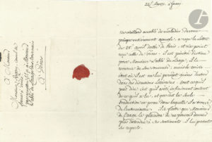 à Turgot ; 1 page in-4, adresse, cachet de cire rouge aux armes.{CR}Message de Voltaire à Turgot.{CR}[Turgot, partant pour l’Italie, avait envoyé à Voltaire une traduction en prose de Virgile]. « Un veillard accablé de maladies, devenu presque entièrement aveugle, a reçu la lettre [...] mais le triste état où il est ne lui permet guères d’entrer dans des discussions littéraires. Tout ce qu’il peut dire c’est qu’il a été infiniment content de ce qu’il a lu, et que c’est la seule traduction en prose dans laquelle il a trouvé de l’entousiasme »...