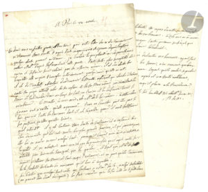 [1775], à l’avocat Gaspard Gaufridy ; 4 pages et demie in-4.{CR}Longue et intéressante lettre dénonçant la conduite du marquis de Sade avec sa femme.{CR}« Il est des choses sur lesquelles elle [Mme de Sade] ne peut s’aveugler interieurement quelqu’envie qu’elle en ait. Il est de nécessité absolue de découvrir le monstre infernal qui cherche à l’abuser contre son propre interêt celui de ses enfans et de son mari même, en reveillant la haine et la discorde dans un temps surtout où l’union et la confiance seroit si nécessaire. Ce monstre, à mon avis, est Mr de S. [Sade] lui-même. […] Vous ne connoissez peut-être pas si bien que moi toutes les tournures dont il est capable quand il veut satisfaire ses passions, qu’elles qu’elles soient. […] ce n’est pas la première fois qu’il agit contre ses interêts pour suivre le transport qui le guide. Il sçait que Made de S. ne peut qu’estimer sa mere et tout ce qui l’entoure, et ne peut qu’être convaincue de la fausseté de toutes les noirceurs qu’il leur a imputées. […] Ne m’a t’il pas envoyé il y a trois mois sous la suscription de Madame, mais de son écriture a lui la copie d’une de ses lettres anonimes avec une grande colere (clairement simulée) et des citations que j’ai vérifié fausses. Dans le tout son style et ses vues percent »... Elle donne longuement son sentiment au sujet de ces lettres anonymes, et explique les raisons de ses soupçons, rapprochant les envois des lettres des déplacements de Sade entre Paris et La Coste ; sa fille lui a écrit « une lettre infâme, dictée ou soufflée par Mr dans sa colere », qui veut faire passer sa mère pour une persécutrice. Il faut absolument réussir à désabuser Mme de Sade, « de qui que viennent ces anonimes »… Il faut aussi « suivre en tout les ordres du Roy donnés par le Ministre »… Elle évoque encore « le nouvel incident », les bruits et les « furieuses craintes » dans la famille de Sade… Il faudrait que son gendre prenne conscience du danger avant qu’il ne soit trop tard : « Il devroit desirer lui-même le moyen le plus sur, et calculer qu’il est toujours avantageux de parer le danger du moment, et de sacrifier quelques années de liberté au repos du reste de sa vie, et de fournir des moyens au rétablissement de son honneur. À 35 ans on a encor bien du temps devant soi. […] Pour moi, qui n’en ai pas tant, fatiguée de toutes ces horreurs, ayant fait en toute circonstance l’impossible pour les sauver, n’en recevant que des injures et des infamies pour reconnaissance, voyant qu’ils veulent se perdre et leurs enfans, lasse d’y sacrifier mon repos et ma santé inutilement, j’abandonnerai tout, ils deviendront ce qu’il plaira à la Providence »…{CR} Ancienne collection Alfred Dupont (I, 11-12 décembre 1956, n° 308).