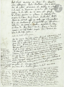 première page et le début de la seconde, le marquis a rassemblé des notes tirées (pour sa défense ?) du Traité des délits et peines de Beccaria, dont nous citons la première : « On ne lui suppose point d’autres crimes parce que la situation le met hors d’état d’en commettre. Reste donc la désertion et nous avons dit plus haut comme quoi elle sera punie »…{CR}À la suite, il a noté une lettre érotique codée, probablement destinée à sa femme :{CR}« Jai une envie de / vous gronder ettonnante cette maniere dont{CR}vous enfiler qui / ne dit mot est affreuse et en vérité{CR}passe tout ce qu’on / peut imaginer avec vous on ne scait jamais ce quon{CR}peut croire et cela / est atroce en réflechissant je sais que ça{CR}nest pas ettonnant /vous vous etes fermée avec moi{CR}depuis le temps que /nous ne sommes plus ensemble, cependant je vous lavoue{CR}je ne vois point de /motifs a votre conduite et vous etes la plus singuliere des{CR}femmes, vous imagines / vous que je vous pardonnerai tout cela vous penses{CR}bien que je dois être / tres ulcere de votre / conduite, adieu je suis [...]{CR}en train comme une / bete comme un ane comme un{CR}etalon espagnol [...] / je vous salue, venes me voir je vous en prie{CR}venes quand vous voudres / vous me faires toujours plaisir et honneur et{CR}vous pouves etre sure que / malgré tout le chagrin que vous me donnés{CR}vous seres bien baisée / oui baisée de tout mon ame »...{CR}Au-dessous, et dans la marge, plan et notes pour Aline et Valcour : « Il faut qu’il ait été amoureux à 20 ans d’une fille en garnison qui ait raffolé de lui, à laquelle il avait fait une promesse de mariage ; il revient à Paris, n’y pense plus, la demoiselle en meurt de chagrin »… Etc. Dans la marge, notes pour la chronologie et l’âge des personnages du roman : « 20 amour / 23 père mort et tue l’ami »… Etc.{CR}On joint une L.A.S. « Montreuil de Sade » de la marquise, 18 mai 1774, réclamant des comptes pour les transmettre à M. de Sade (1 p. in-4).