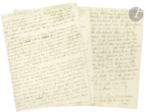 Donatien-Alphonse-François, marquis de SADE. 2 L.A., [Paris an VI : avril-juillet 1798], au citoyen Gaufridy père, « homme de loi » à Apt ; 4 pages et demie et 1 page in-4, la 2e avec adresse.{CR}3 floréal (22 avril). Il n’a plus un...