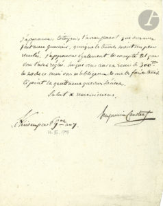 Benjamin CONSTANT (1767-1830). L.A.S., Hérivaux 6 germinal VII (26 mars 1799), à un Citoyen ; demi-page in-4.{CR}Il approuve l’arrangement pris par son correspondant, « quoique les termes soient un peu reculés. J’approuve également le...