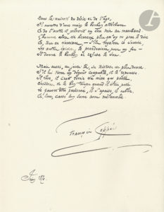 épicier de Montrouge ;{CR}Et sa boutique sombre, aux volets peints en rouge,{CR}Exhalait une odeur fade sur le trottoir.{CR}On le voyait debout, derrière son comptoir,{CR}En tablier, cassant du sucre avec méthode »...{CR}Ancienne collection André Bertaut (14 décembre 1983, n° 59).{CR}On joint une photographie avec dédicace a.s. « À mon cher Giacomelli, pour qu’il me confonde avec Paulus François Coppée » (photo Reutlinger, in-8).