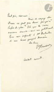 Gustave FLAUBERT (1821-1880). L.A.S., Croisset mercredi [vers 1866 ?], à son ami Eugène Bataille ; demi-page in-8.{CR}« Tant pis, cher ami ! Mais ce voyage du Havre ne peut pas durer jusqu’à la fin de 7bre ? Dès que tu seras revenu...