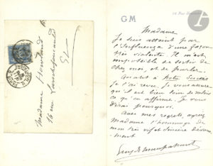 Guy de MAUPASSANT (1850-1893). L.A.S., [Paris 11 mars 1891], à Mme Howland ; 1 page in-8 à son chiffre et adresse 24 rue Boccador, enveloppe.{CR} Violemment atteint par l’influenza, il ne peut sortir ni parler. « Quant à notre succès je...