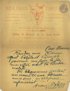 ma signature a une valeur d’actualité pour donner dans la Grande Revue mon étude sur Barbey d’Aurevilly »... Il rappelle que la revue lui doit toujours depuis un an les 170 fr. de son article sur L’interprétation wagnérienne …{CR}On joint une L.A.S. à l’en-tête et vignette Rosae Crucis Templi Ordo, Deuxième Geste esthétique pour mars-avril 1893, Salon & Soirées de la Rose-Croix … Il cherche un « débutant disponible » pouvant jouer le Sar, car son acteur vient de tomber malade…