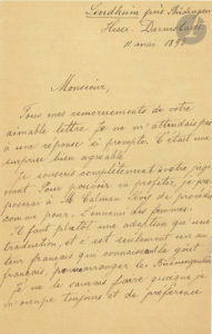 Leopold von SACHER-MASOCH (1836-1895). L.S., Lindheim 11 mai 1892 ; 1 page et demie in-8 ; en français.{CR}Il remercie son correspondant, et se rallie à son jugement : « je proposerai à M. Calman Lévy de procéder comme pour L’ennemi des...