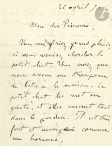 Émile ZOLA. L.A.S., 21 avril 1870, à Camille Pissarro ; 2 pages in-12.{CR}« Mon cher Pissarro, Vous me feriez grand plaisir, si vous veniez chercher le petit chat. Vous savez que nous avons un troupeau de bêtes à la maison. Ce petit chat les...
