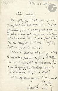 Émile ZOLA. L.A.S., Médan 26 novembre 1871, à Marguerite Charpentier ; 1 page in-8.{CR}Au sujet d’un épisode de Nana (qui paraîtra en 1879), à la femme de son éditeur.{CR}« Merci mille fois. C’est à moi que vous donnez tort. Le bal...