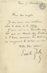 aura lieu le jour du contrat ; je m’arrangerai pour ça. L’idée d’une fête dans un château est impossible, car il me faut l’hôtel des Muffat à Paris. Enfin, tout va pour le mieux ».{CR}Il a répondu « par un refus à Castellano qui me demandait de reprendre Thérèse Raquin au Chatelet, vers le 20 décembre »…{CR}On joint une L.A.S. du 17 décembre 1871 à un confrère, donnant son « adhésion pour le dîner de la Cloche » (1 p. in-8).