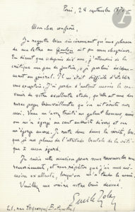Émile ZOLA. L.A.S., Paris 28 septembre 1876, [à Marius Topin] ; 1 page in-8.{CR}Sur les attaques de la critique contre lui.{CR}« Mon cher confrère, Je regrette bien sincèrement qu’une phrase de ma lettre au Gaulois ait pu vous chagriner. En...