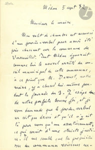 Émile ZOLA. L.A.S., Médan 5 septembre 1882, [à Gaston Rennes, maire de Vernouillet] ; 2 pages in-8.{CR}« Mon valet de chambre est menacé d’un procès-verbal pour avoir été pris chassant sur la commune de Vernouillet. Tout Médan ignorait...