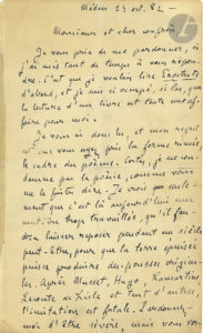 Émile ZOLA. L.A.S., Médan 24 octobre 1882, à un cher confrère [Léon Duplessis] ; 3 pages in-8 (fentes aux plis réparées).{CR}Belle lettre des conseils littéraires et sur la poésie.{CR}Il a lu son Érostrate : « je suis si occupé, si...
